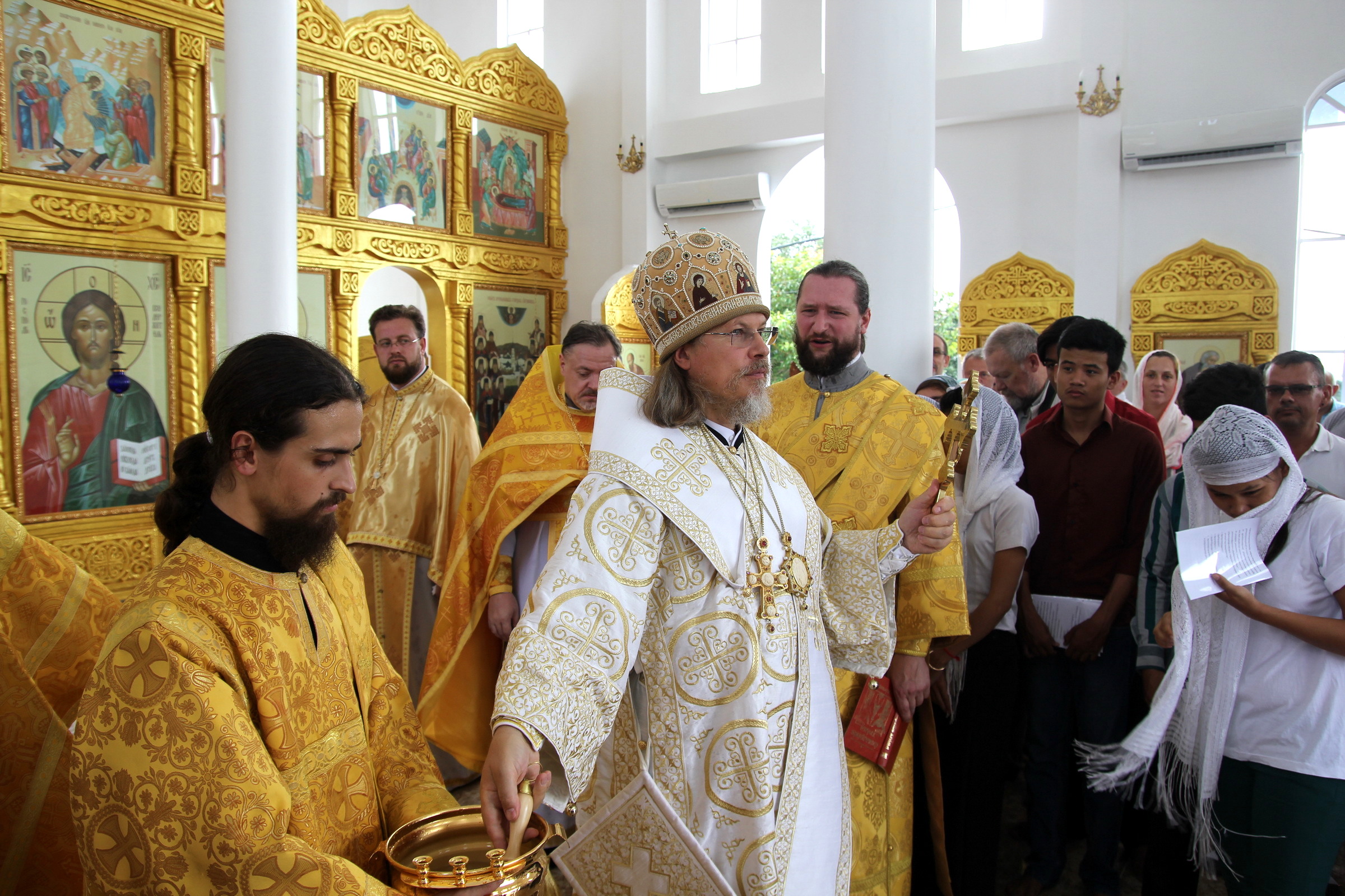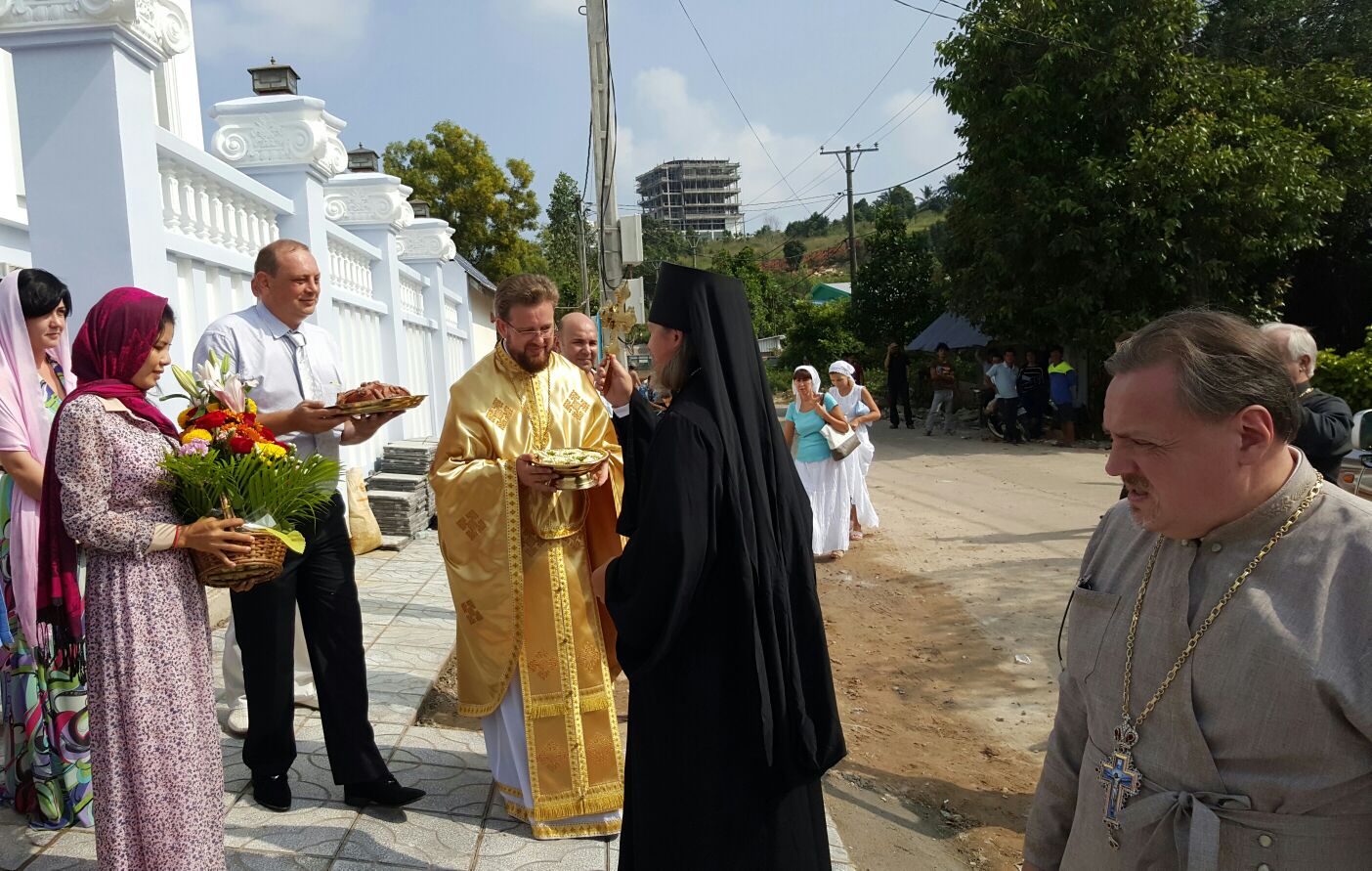 В воскресение, 25-го октября 2015 г., церковная делегация во главе с Высокопреосвященнейшим архиепископом Марком направилась в г. Сиануквиль, где было совершено Великое Освящение храма во имя святого великомученика Пантелеимона и Божественная Литургия. У ворот храма Владыку Марка встречали и.о. настоятеля приходов Московского Патриархата в Камбодже иеромонах Паисий (Ипате), председатель приходского совета Свято-Пантелеимоновского прихода М.Ю. Рюмшин, благотворители храма, многочисленная русско-камбоджийская паства. Специально для присуствия на службу Великого Освящения в Сиануквиль прибыл Посол России в Камбодже. По обычаю, на Литургии, чтения из Апостола и Евангелии, а также Символ Веры и “Отче наш” были прочитаны и на кхмерском языке. После Божественной Литургии архиепископ Марк наградил орденами и медалями благотворителей храма и труженников православных приходов в Королевстве Камбоджа, а также передал православным кхмерам молившихся за Божественной Литургией «Православный Молитвослов» на кхмерском языке, который был издан недавно. По приглашению церковного представительства и при содействии Посла России в Камбодже Д.Ю. Цветкова, на церемонии открытия храма присуствовала высокая делегация Министерства Культов и Религии Королевства Камбоджи.