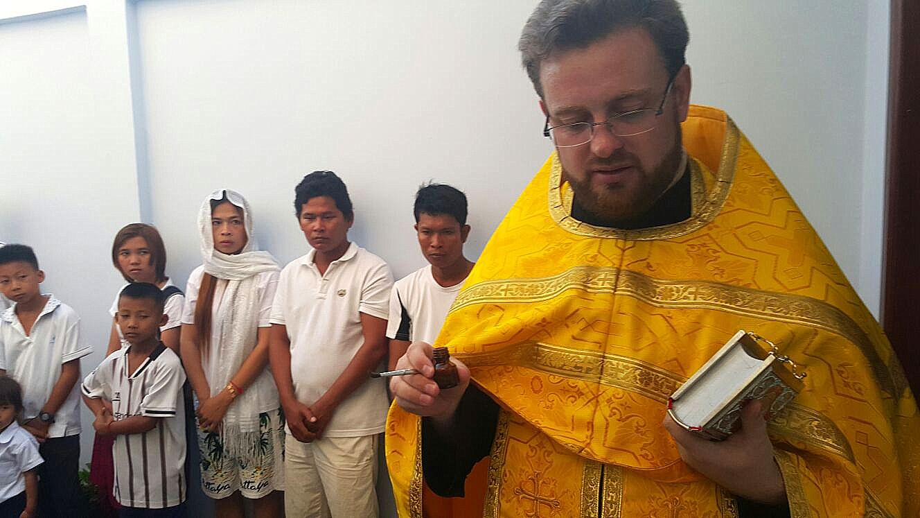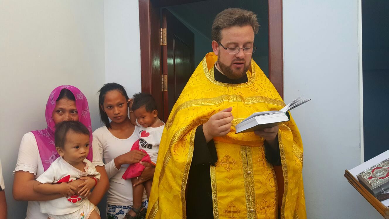 По завершении, и.о. настоятеля приходов Московского Патриархата в Камбодже иеромонах Паисий (Ипате) поздравил всех и преподнес в дар неофитам Молитвослов и Евангелие на кхмерском языке.