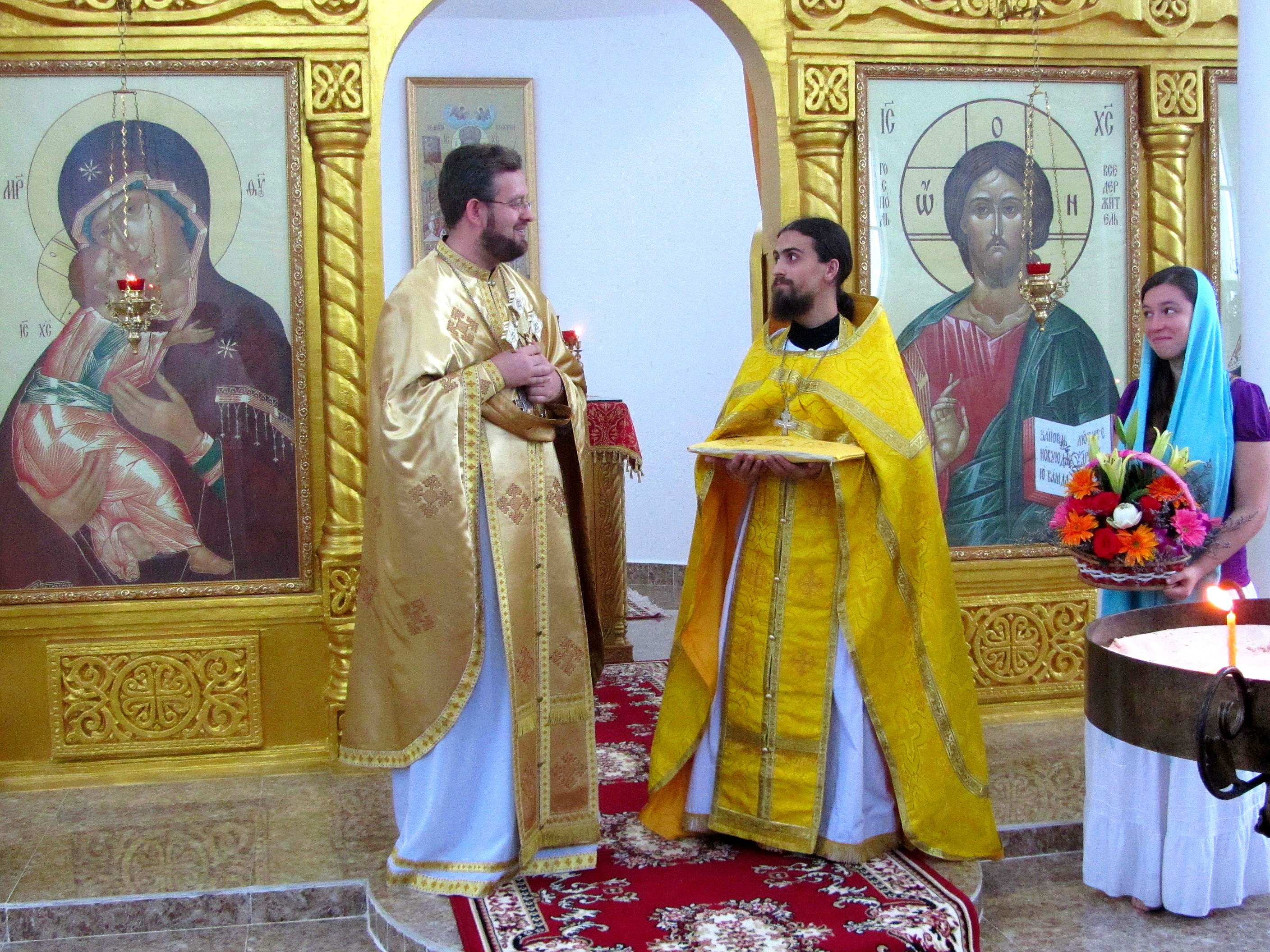 По благословению Представителя Русской Православной Церкви в Таиланде, архимандрита Олега (Черепанина), иеромонах Паисий представил русско-камбоджийской пастве нового священнослужителя и попросил принять его с радостью и надеждой, а также помочь отцу Роману и матушке адаптироваться. Потом, староста прихода М.Ю. Рюмшин и его супруга приветствовали от имени прихода нового пастыря и приподнесли ему в дар малый богослужебный комплект иерейского облачения, а матушке Ксении букет цветов.