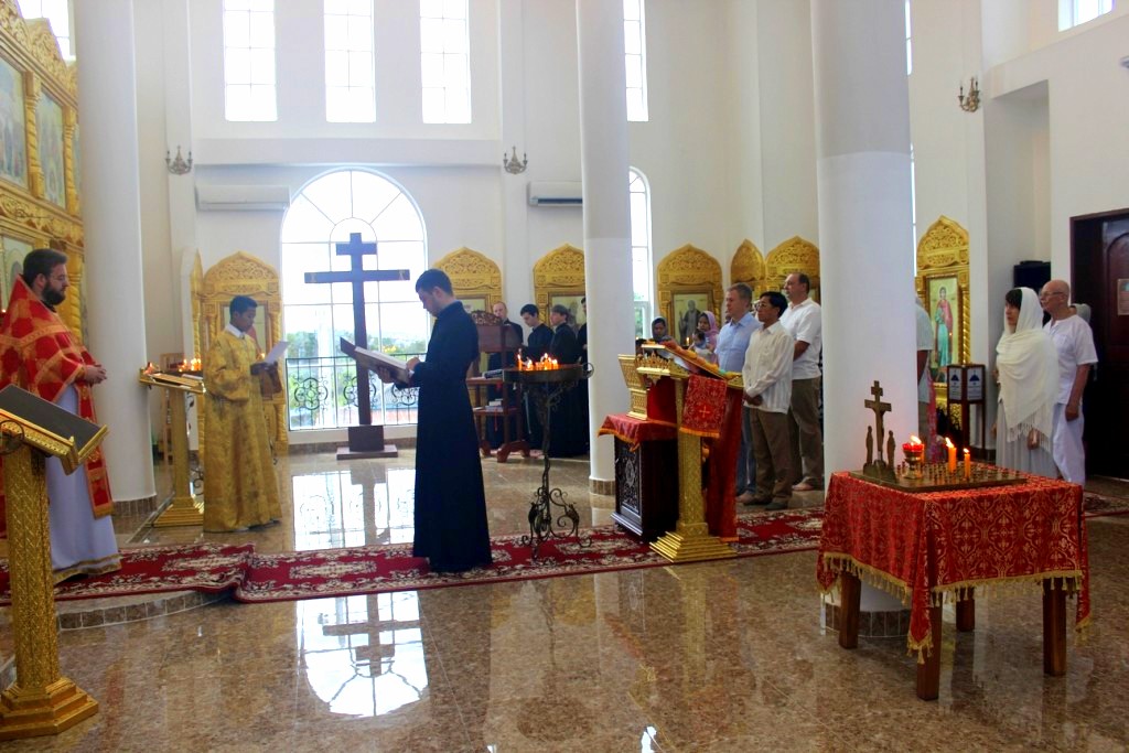 9 августа 2016 г. в храме св. великомученика и целителя Пантелеимона г. Сиануквиля прошли торжества по случаю престольного праздника – дня памяти святого. По благословению Представителя Русской Православной Церкви в регионе архимандрита Олега (Черепанина) и в соответствии с просьбой и.о. настоятеля Пантелеимоновского храма в Сиануквиле иерея Романа Постникова и приходского совета храма, в Камбоджу для возглавления торжеств был направлен иеромонах Паисий (Ипате), проректор Духовного Училища на Пхукете, ранее несший послушание и.о. настоятеля православных приходов в Камбодже, а также хор Свято-Николаевского собора г. Бангкока под управлением регента В. Маршалковского.