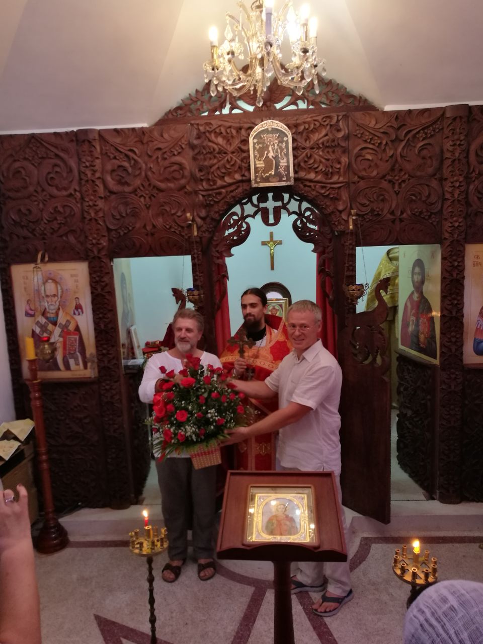 По окончании богослужения иер. Роман совместно с Никитиным Д.Ю. вручили г-ну Послу букет цветом, поздравив его с Днем войск Болгарии, который отмечается ежегодно в день памяти вмч. Георгия Победоносца.