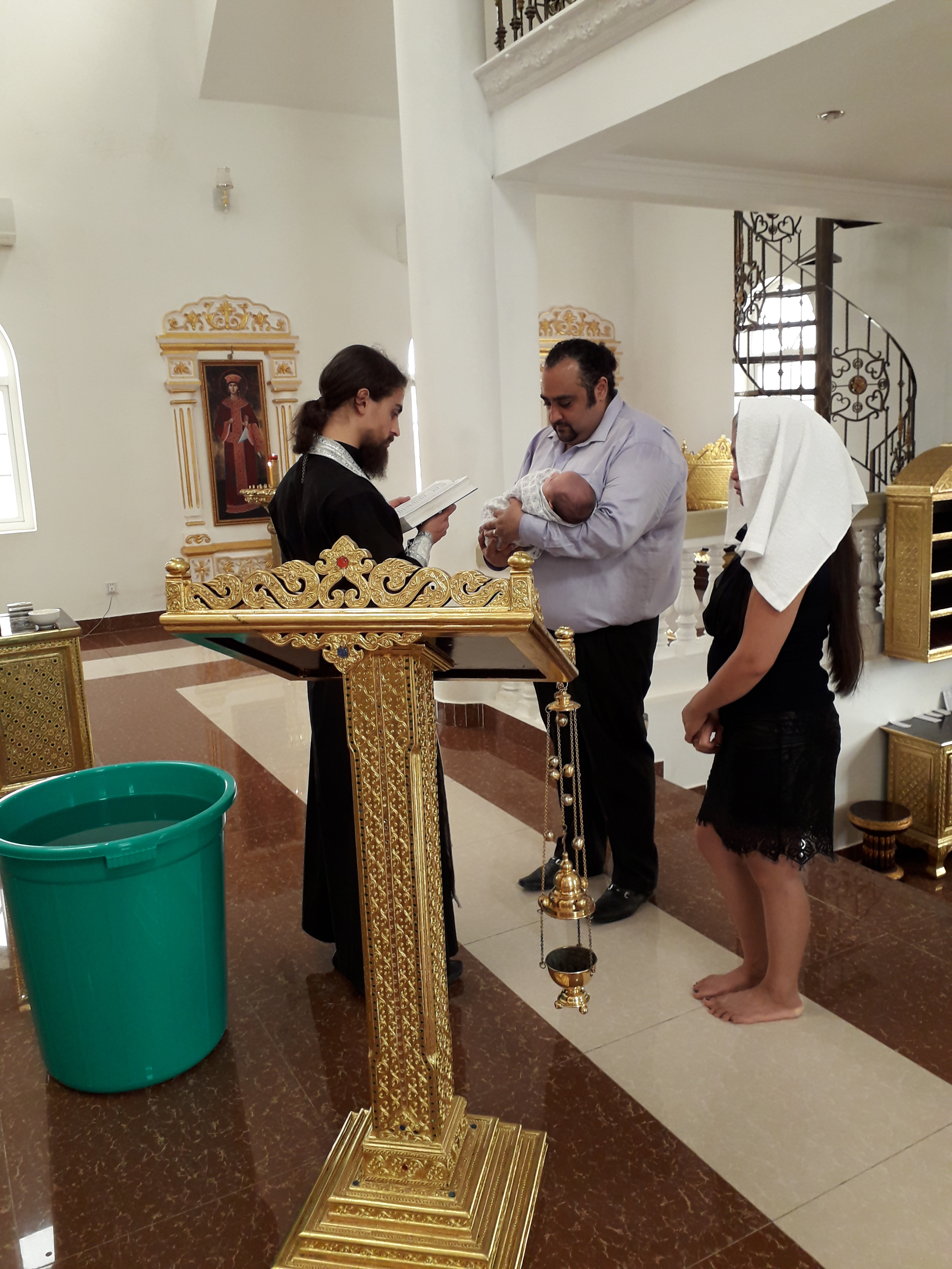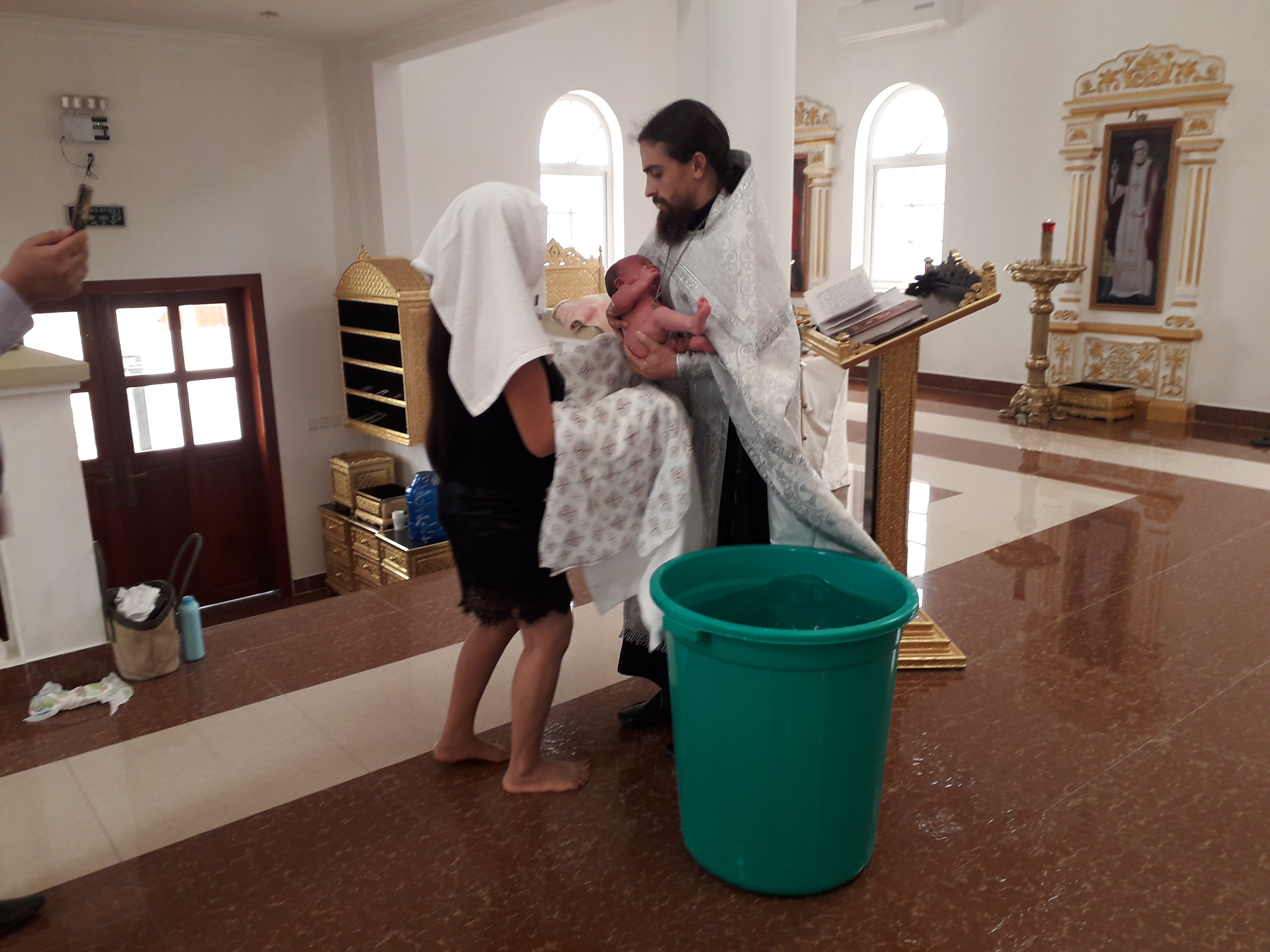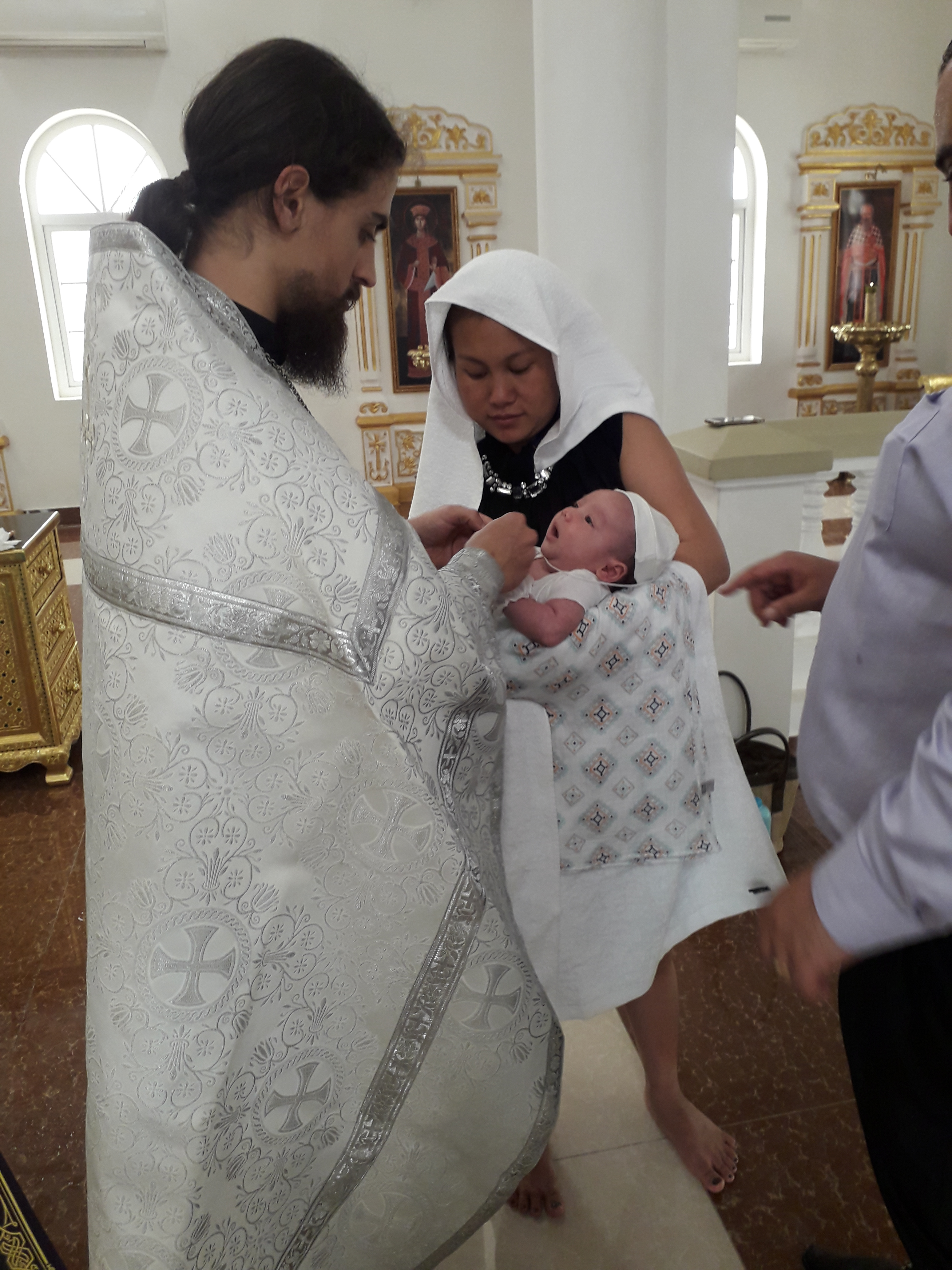Таинство Крещения совершил иер. Роман Постников, клирик Свято-Пантелеимоновского прихода, который также стал восприемником младенца. 17 июня в Воскресный день новопросвещённый впервые причастился Пречистой Крови Христовой.