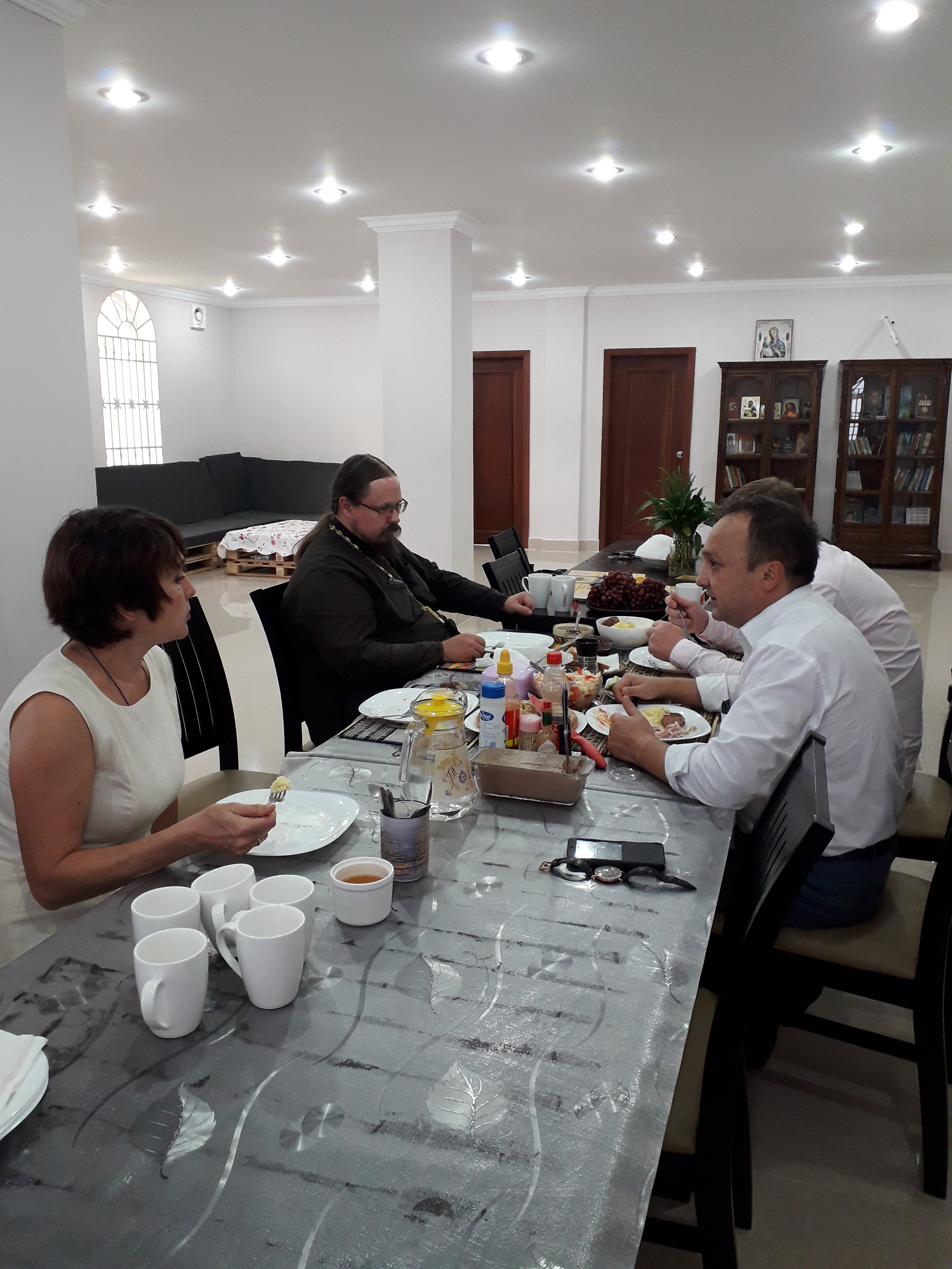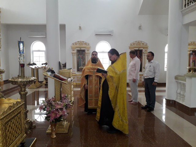 По прибытии в храм был отслужен краткий молебен в сослужении иер. Романа Постникова, клирика Свято-Пантелеимоновского прихода г. Сиануквиль. После молебна прихожане имели возможность лично пообщаться с о. Георгием в приходской трапезной – узнать о развитии православной миссии в мире и на Филиппинах в частности, услышать интересные истории обращения людей ко Христу. И получить от него в подарок авторские экземпляры новых книг, изданных Православным миссионерским обществом имени прп. Серапиона Кожеозерского. К сожалению, из-за времени визита в середине рабочего дня, многим прихожанам не удалось прийти на встречу.