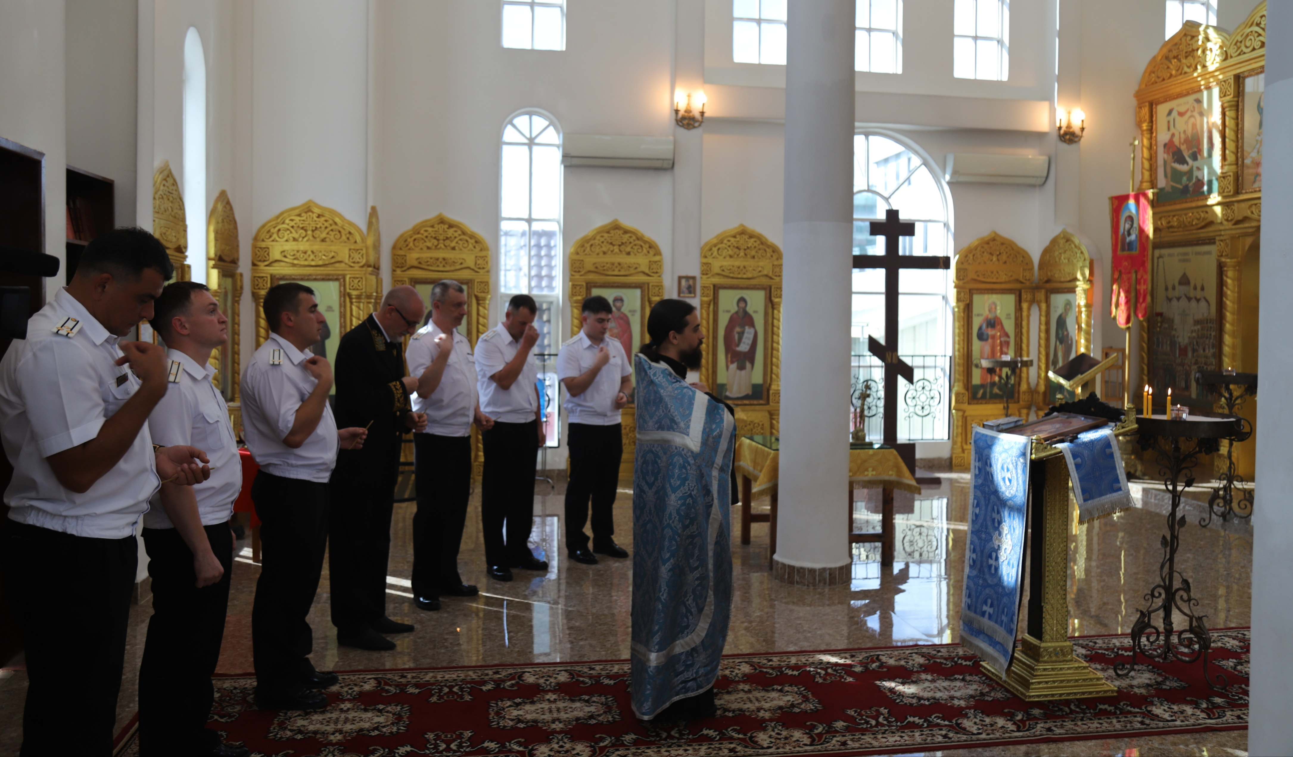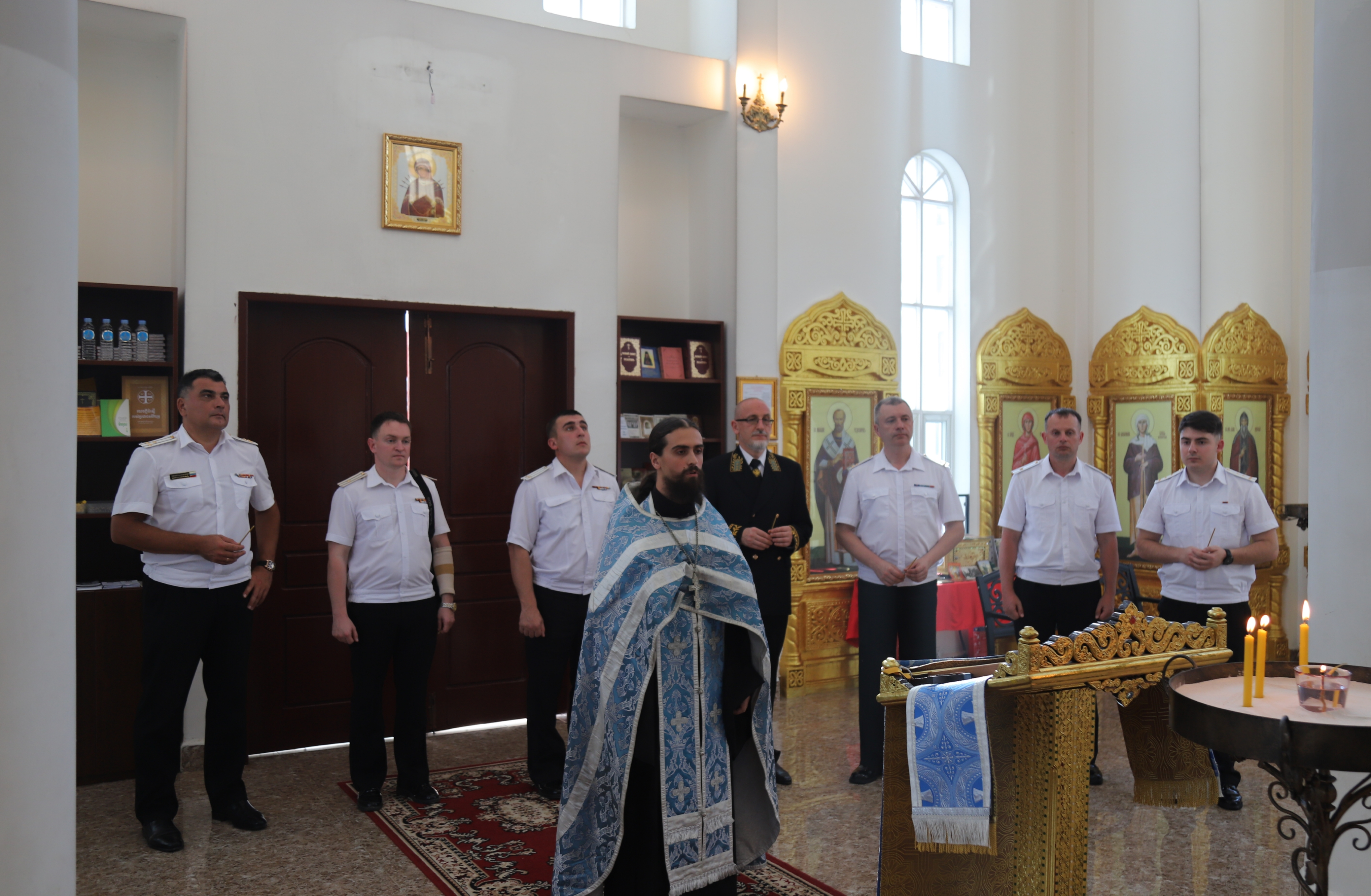 Молебен совершил и.о. настоятеля Свято-Пантелеимоновского прихода иер. Роман Постников. В молитве приняли участие гости храма – Чрезвычайный и Полномочный Посол России в Камбодже Цветков Д.Ю., Капитан 1 ранга, Военный, Военно-воздушный и Военно-морской атташе Стадченко И.Н. и экипаж военного корабля “Перекоп”, находившегося в порту г. Сиануквиль.